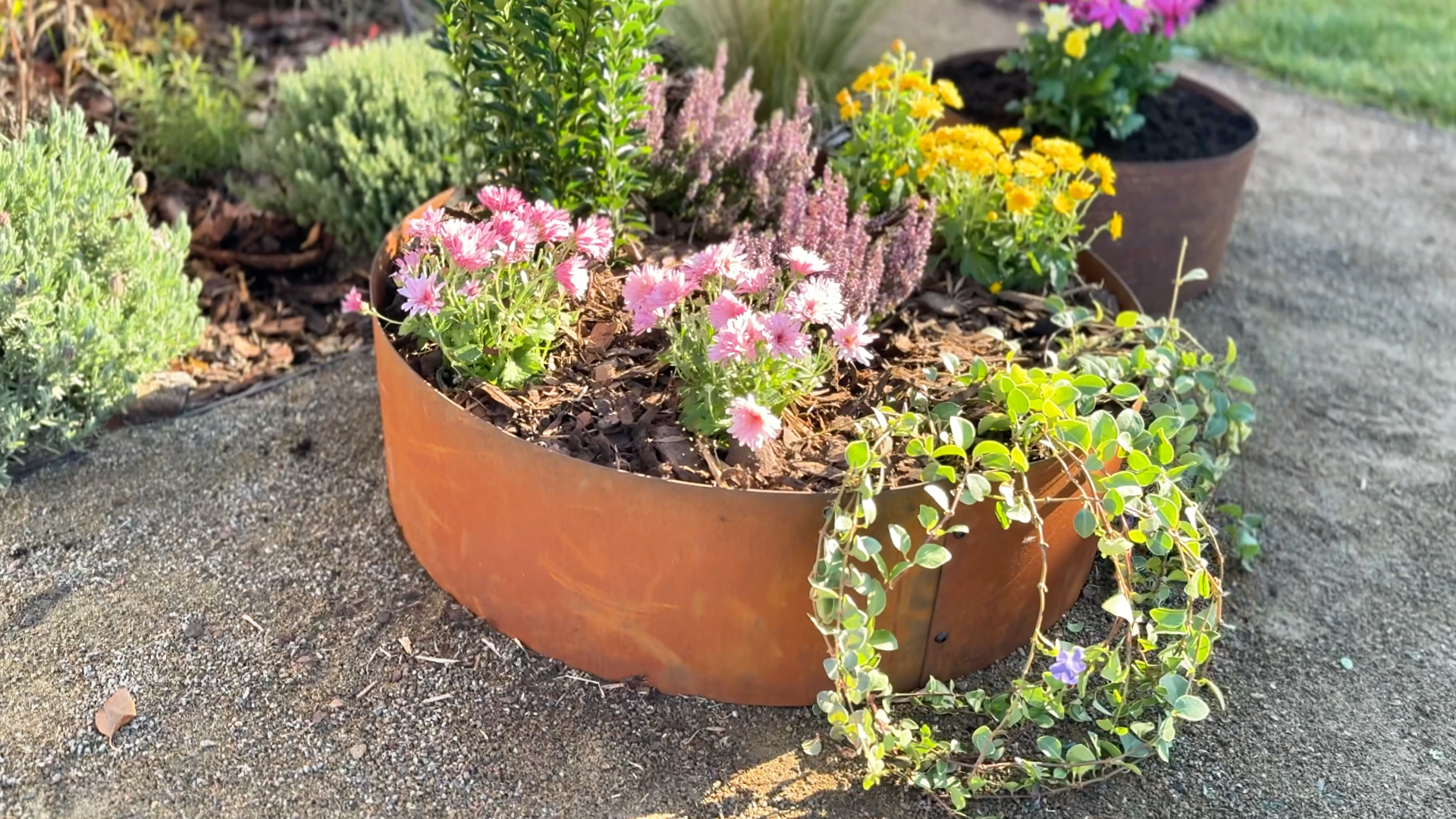 Metall-Rasenkante mit Erdspießen - Cortenstahl, Höhe 15 cm, Länge 5–10 m (5–10 Stück)