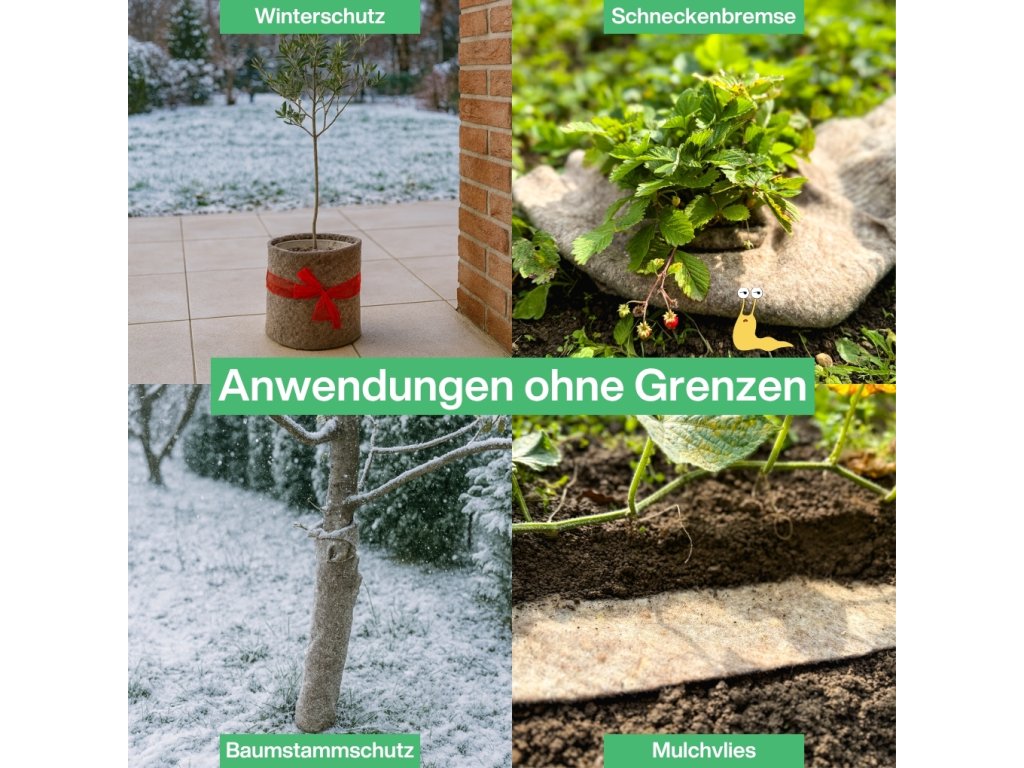 Dieses Bio-Gartenvlies verhindert effektiv das Wachstum von Unkraut, schützt Kübelpflanzen vor Frost, hält die Bodentemperatur konstant, speichert Feuchtigkeit und hält Schnecken ab. Darüber hinaus setzt die Wolle nach und nach Nährstoffe wie Kalium und Stickstoff frei, die das Pflanzenwachstum fördern.