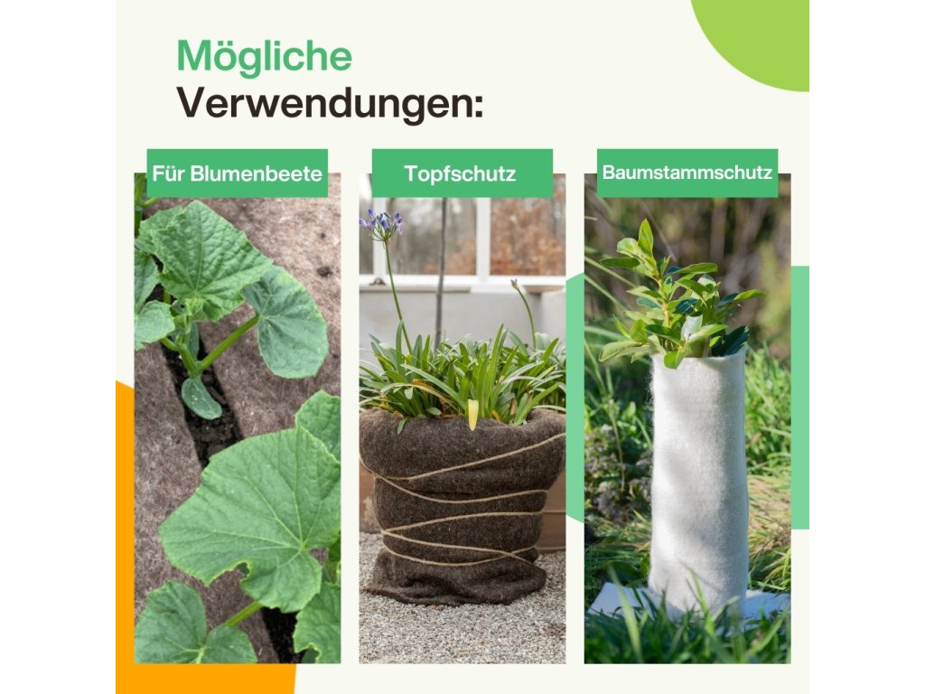 Ideal zum Abdecken von Beeten bei der Pflanzung von Setzlingen. Schützt Baumstämme vor Frost und Schnecken. Kann auch als Wärmeschicht für Blumentöpfe verwendet werden und schützt so die Wurzeln vor dem Einfrieren.