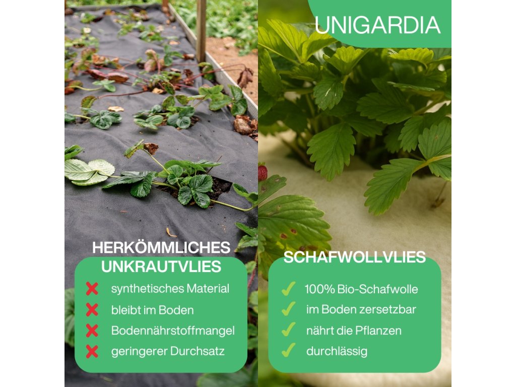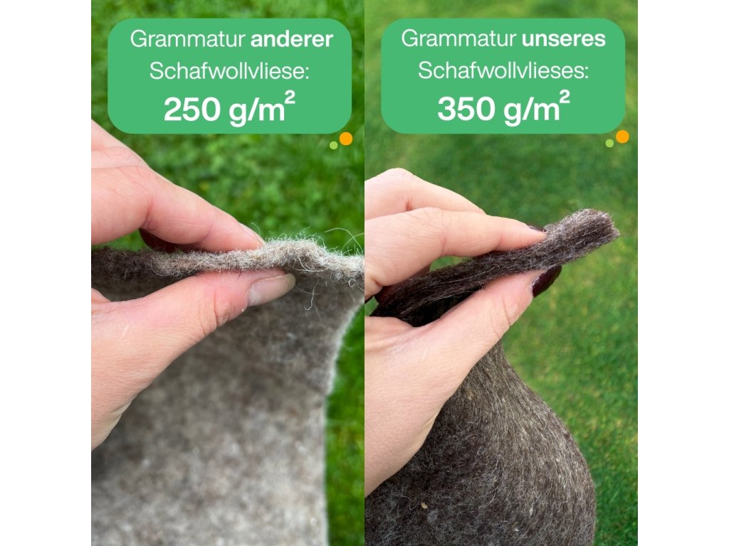 Hergestellt aus 100 % Schafwolle, die keine weitere Verwendung findet. Durch das hohe Flächengewicht von 350 g/m² zersetzt sich das Vlies im Boden nur sehr langsam – es hält mehrere Jahre und bereichert den Boden mit wertvollen Nährstoffen wie Kalium und Stickstoff. Im Gegensatz zu synthetischen Materialien hinterlässt es kein Mikroplastik.