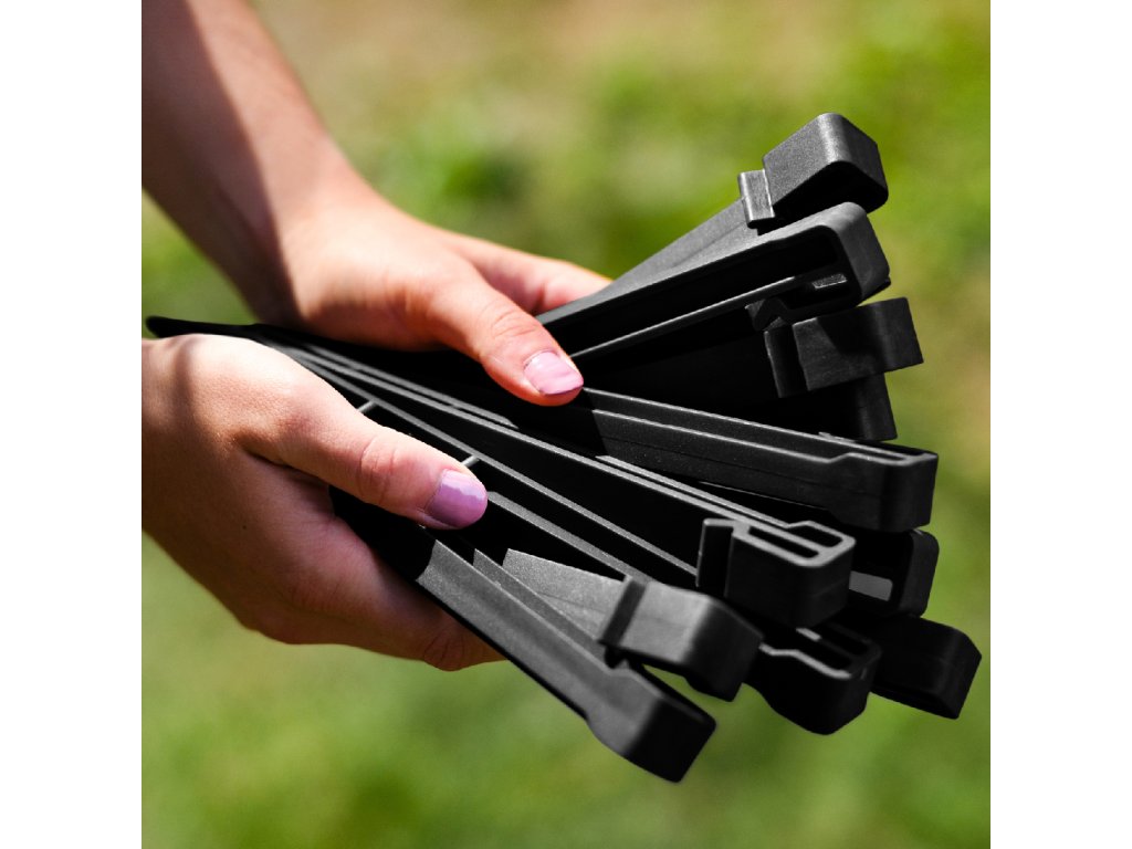 Die Erdnägeln werden aus einem sicheren Material hergestellt, das vollständig aus recycelten Quellen stammt – hochwertiger Kunststoff – dies garantiert lange Lebensdauer.