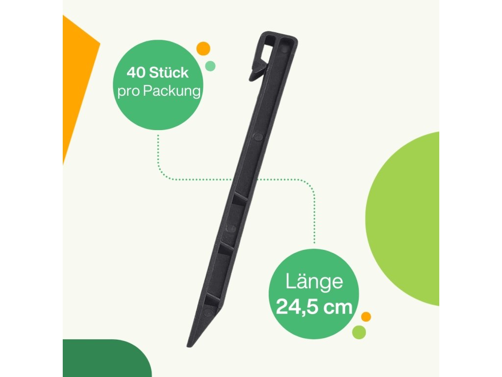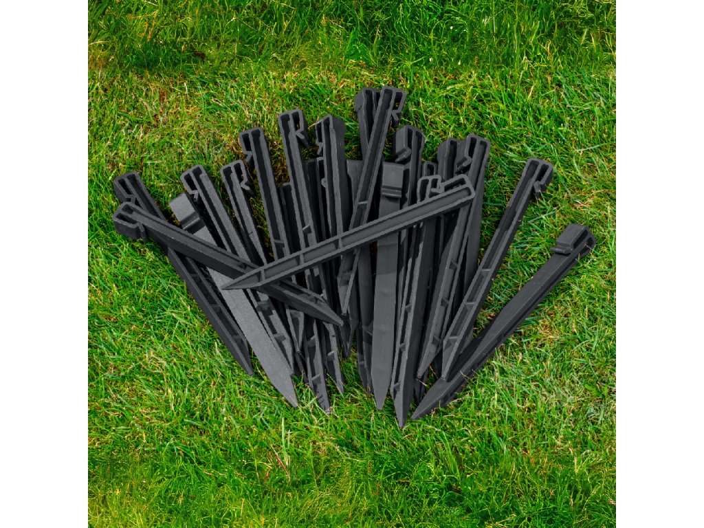 Kunststoffnägel für Rasenkanten – stabil, widerstandsfähig und umweltfreundlich. Sorgen Sie mit hochwertigen Erdnägeln aus recyceltem Kunststoff für maximale Stabilität Ihrer Rasenkanten. Dank ihrer Länge und Konstruktion halten sie die Rasenkanten auch in schwierigem Gelände fest an ihrem Platz. Die Packung enthält 40 Stück.