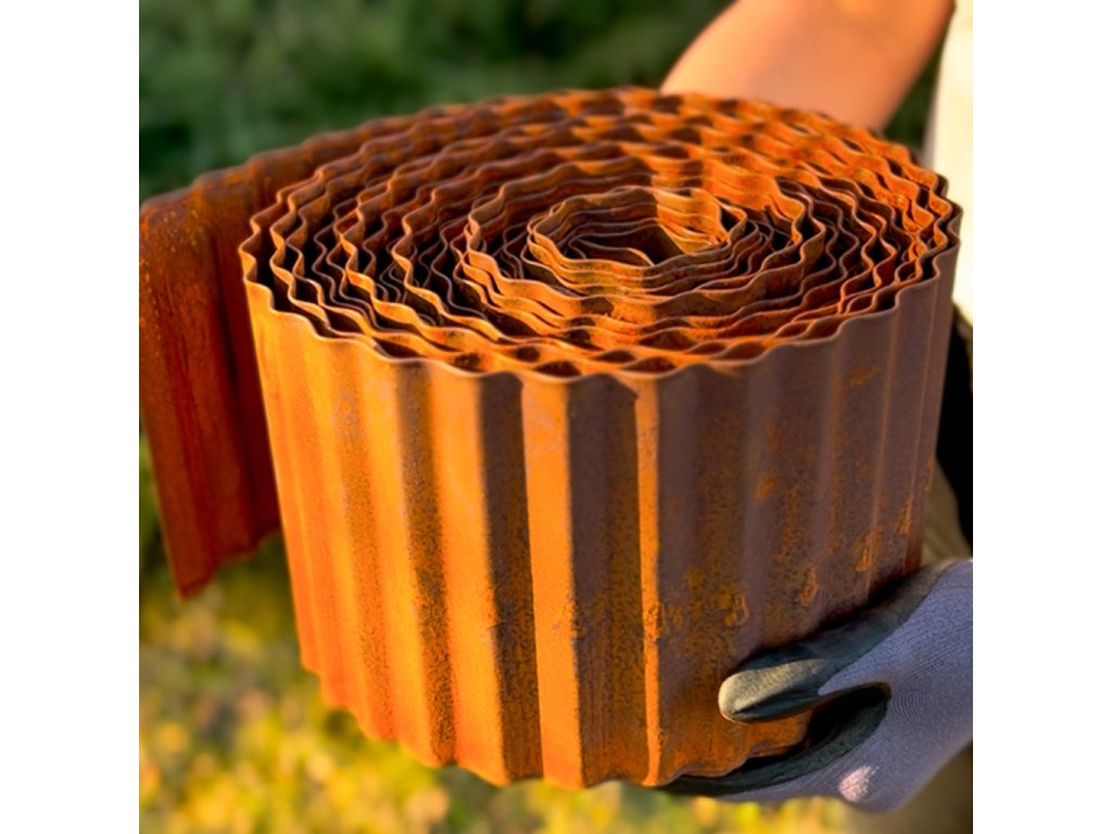Die Rasenkante ist aus einer hochwertigen Corten-Stahl-Legierung hergestellt. Es handelt sich nicht um ein Rostspray, sondern um ein natürlich reagierendes Material, das mit der Zeit und durch Verwitterung eine dekorative Rostpatina entwickelt.