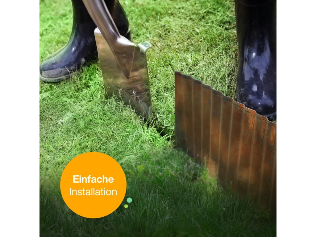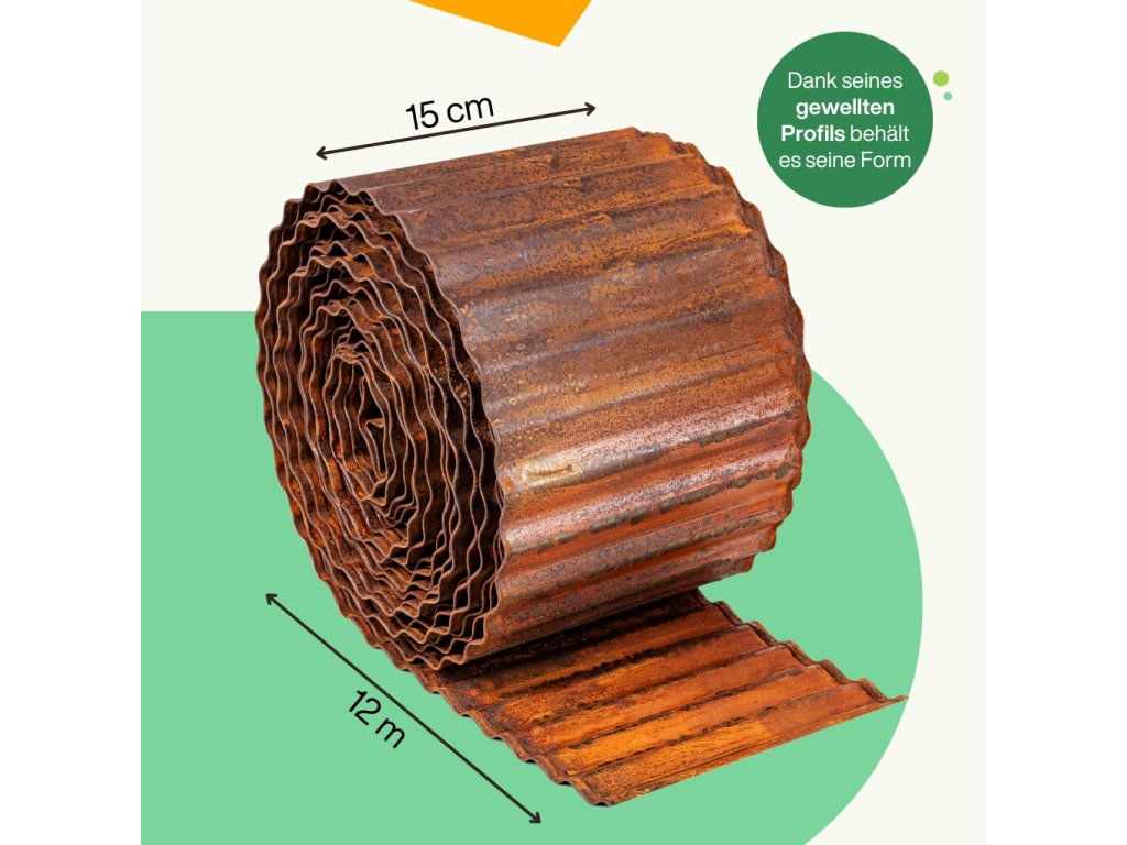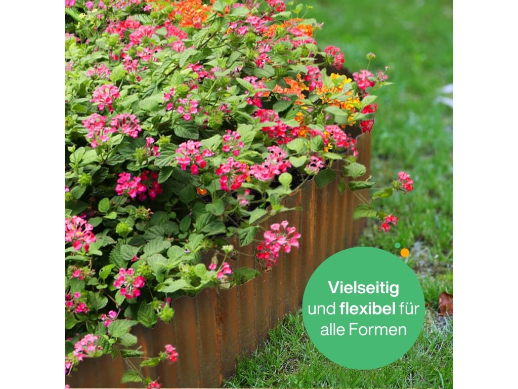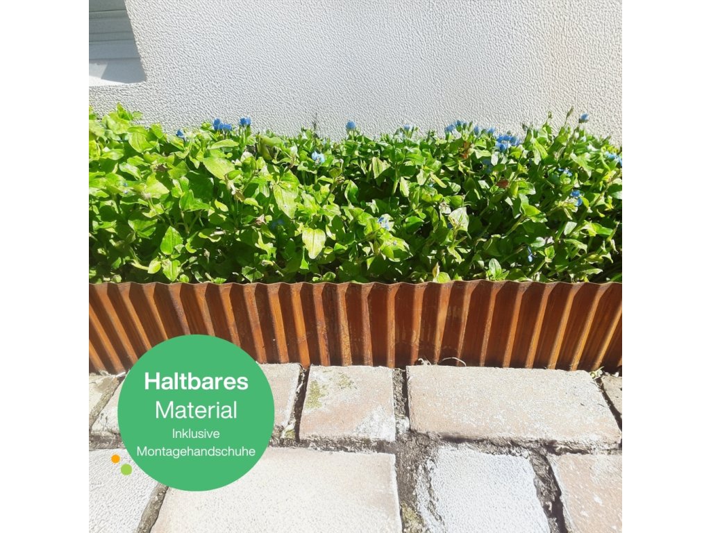 Der gewellte, 15 cm hohe Metall-Beeteinfassung aus Cortenstahl ist stabil, widerstandsfähig und designtechnisch einzigartig. Durch die gewellte Form ist die Beetbegrenzung besonders druckbeständig gegenüber dem Erdreich, während der Cortenstahl im Laufe der Zeit eine natürliche Rostpatina entwickelt, die Ihrem Garten einen rustikalen, natürlichen Charme verleiht. Ideal für Liebhaber langlebiger und pflegefreier Materialien.