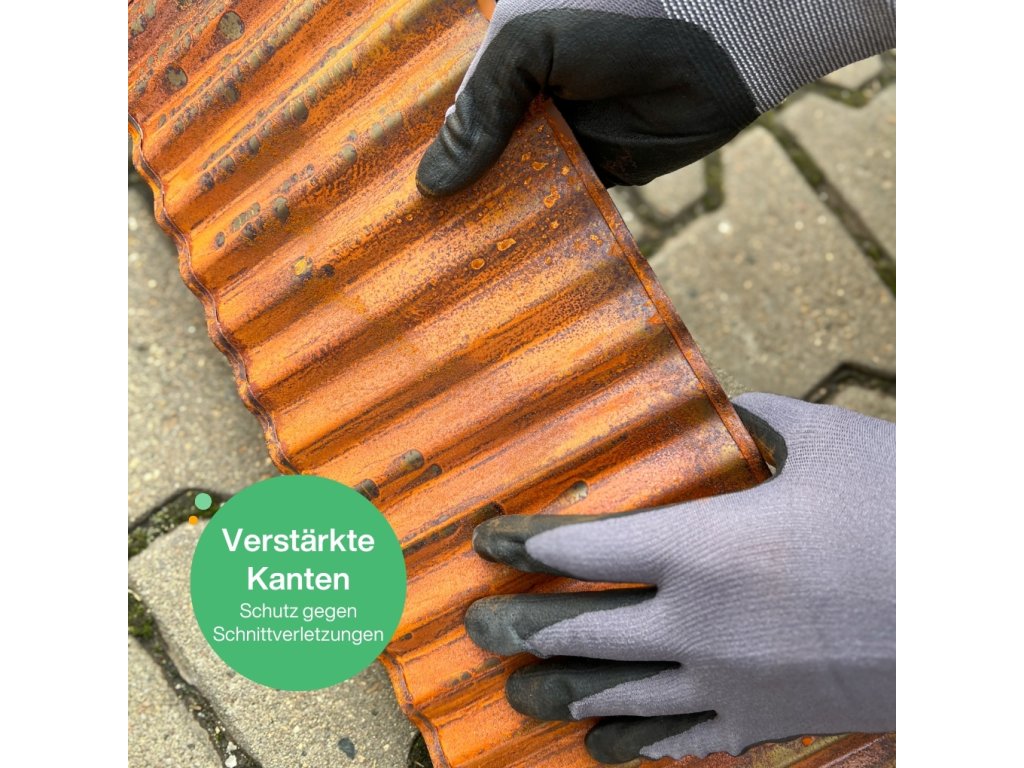 Die Beeteinfassung aus Metall besitzt auf der Ober- und Unterseite keine aufstehenden Ecken, sondern eine Schutzkante, die zur Vorbeugung gegen Verletzungen dem sorgenfreien Einsatz dient. Außerdem erhalten Sie im Paket ein Paar Montagehandschuhe.