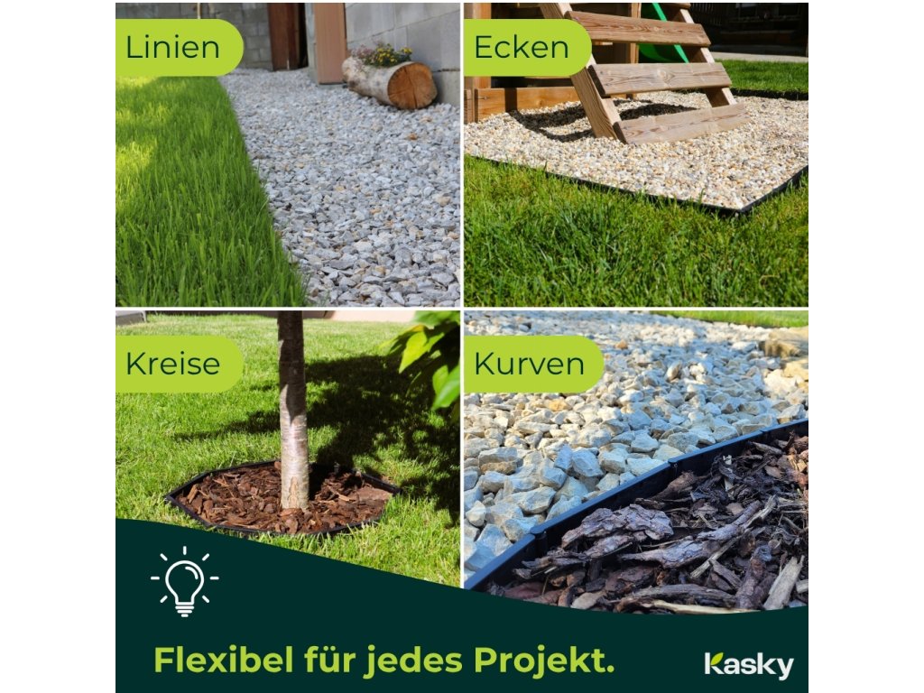 Funktioniert für Ecken, Kurven, Kreise oder geraden Linien. Sie können die Kasky Beetbegrenzung und Beetumrandung in unendlicher Länge verbinden und sie behält immer ihre Festigkeit.