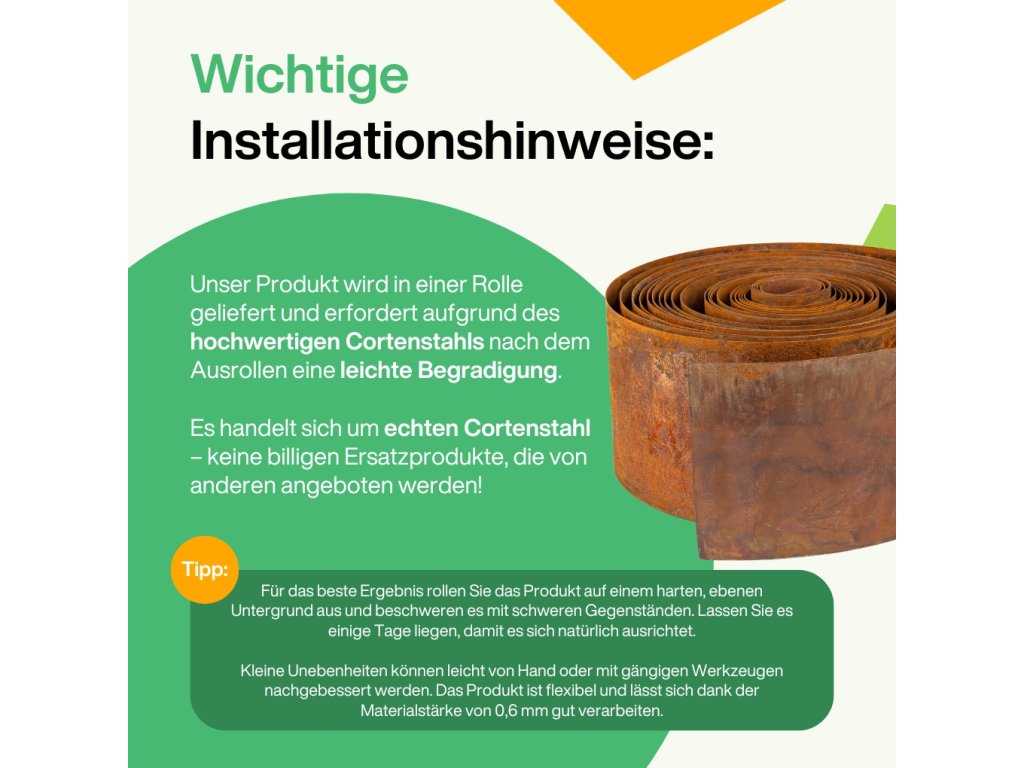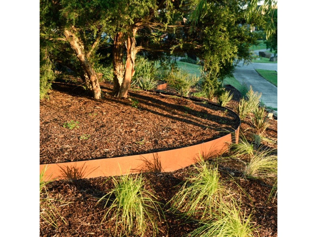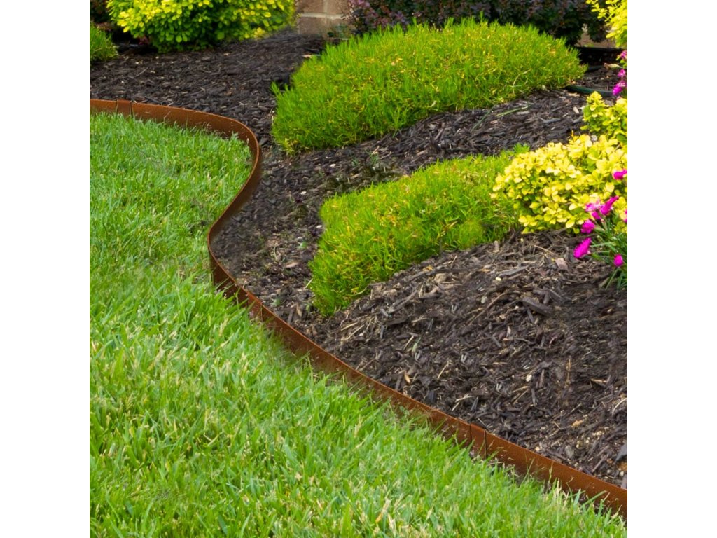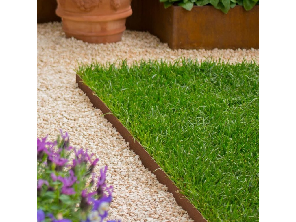 Die Rasenkante ist aus einer hochwertigen Corten-Stahl-Legierung hergestellt. Es handelt sich nicht um ein Rostspray, sondern um ein natürlich reagierendes Material, das mit der Zeit und durch Verwitterung eine dekorative Rostpatina entwickelt.