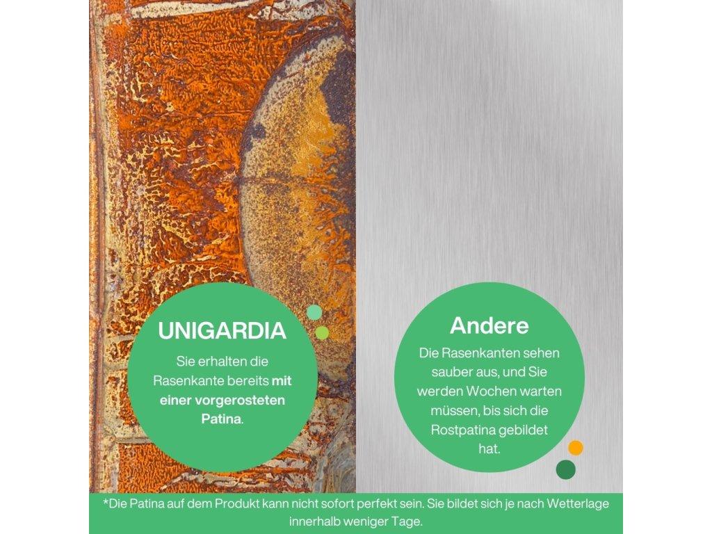 Bei den meisten Produkten muss man warten, bis sich die Beetbegrenzung mit der Zeit verfärbt. Unsere UNIGARDIA Rasenbegrenzung erhalten Sie bereits mit einer rostigen Patina, die aber mit der Zeit weiter altert.