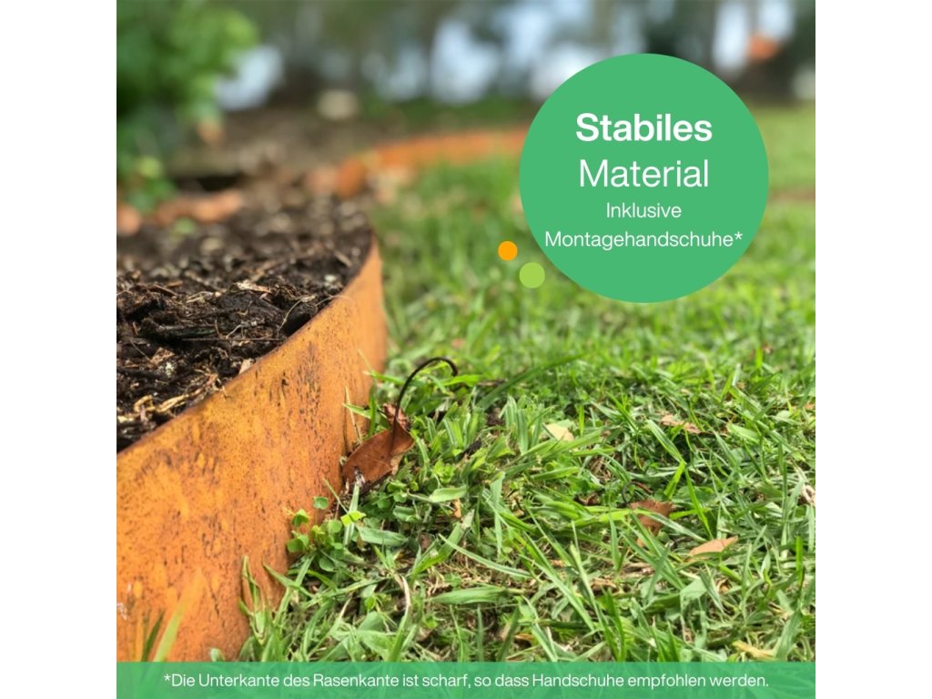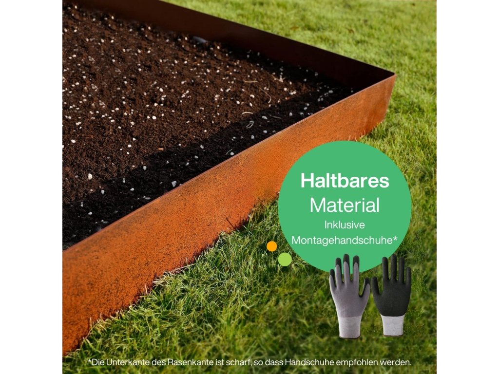 Die Beeteinfassung aus Metall besitzt auf der Oberseite keine aufstehenden Ecken, sondern eine Schutzkante, die zur Vorbeugung gegen Verletzungen dem sorgenfreien Einsatz dient. Außerdem erhalten Sie im Paket ein Paar Montagehandschuhe.