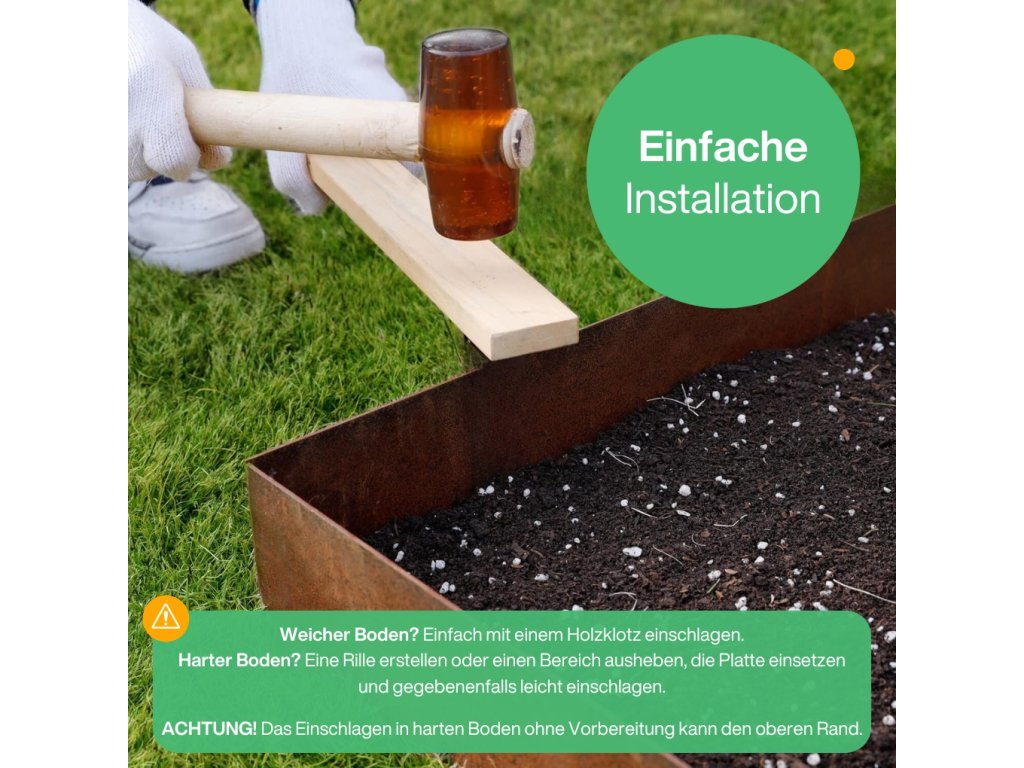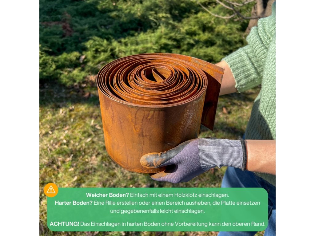 Es hängt von der Bodenart ab, in die die Corten-Rasenkante eingesetzt wird. In jedem Fall empfehlen wir, den Boden zuerst vorzubereiten, indem Sie mit einem Spaten einen Graben ziehen, in den die Rasenkante anschließend eingesetzt wird. Die eingesetzte Rasenkante können Sie dann mit einem Holzklotz leicht einschlagen – legen Sie den Klotz auf die obere Kante der Rasenkante und klopfen Sie vorsichtig mit einem Gummihammer darauf. Bitte beachten Sie: Beim Einschlagen in harten Boden ohne vorherige Vorbereitung besteht die Gefahr, die obere Kante der Rasenkante zu beschädigen. Für eine leichtere und komfortablere Montage legen wir jeder Lieferung zusätzlich Schutzhandschuhe bei. -