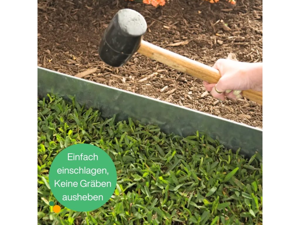 Es hängt von der Bodenart ab, in die die Corten-Rasenkante eingesetzt wird. In jedem Fall empfehlen wir, den Boden zuerst vorzubereiten, indem Sie mit einem Spaten einen Graben ziehen, in den die Rasenkante anschließend eingesetzt wird. Die eingesetzte Rasenkante können Sie dann mit einem Holzklotz leicht einschlagen – legen Sie den Klotz auf die obere Kante der Rasenkante und klopfen Sie vorsichtig mit einem Gummihammer darauf. Bitte beachten Sie: Beim Einschlagen in harten Boden ohne vorherige Vorbereitung besteht die Gefahr, die obere Kante der Rasenkante zu beschädigen. Für eine leichtere und komfortablere Montage legen wir jeder Lieferung zusätzlich Schutzhandschuhe bei. -