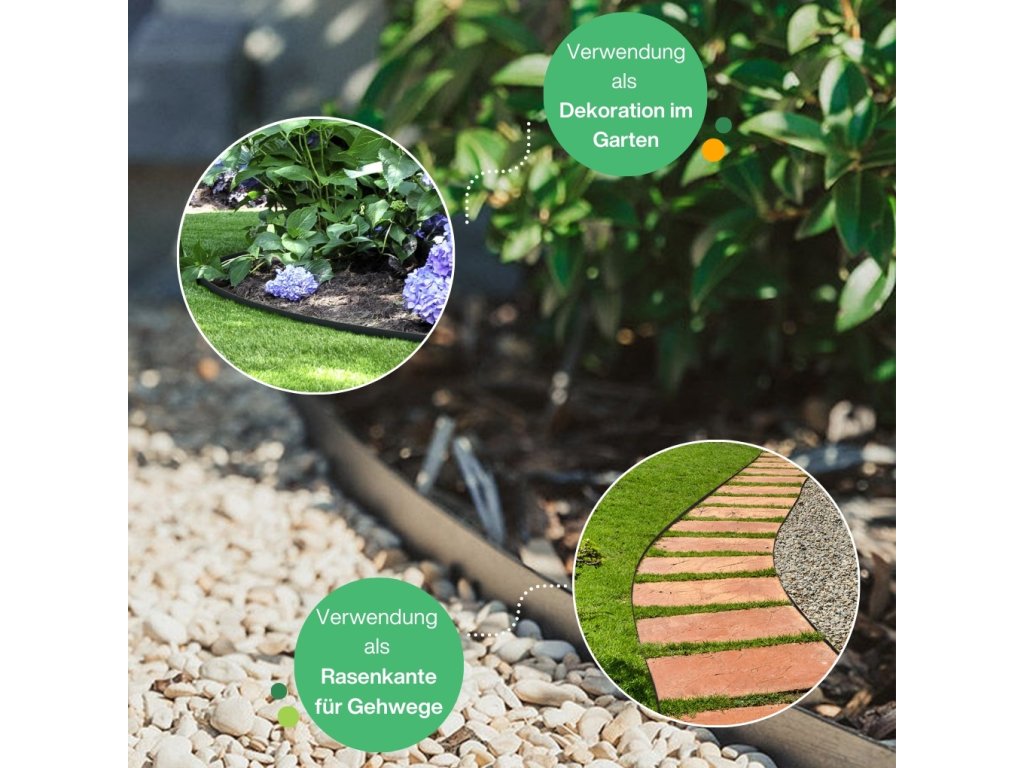Die Rasenkanten aus Metall sind gegen Korrosion und Abblättern geschützt, auch witterungs- und fäulnis-beständig und bieten eine zuverlässige Leistung im Außeneinsatz. Die außergewöhnliche Stoßfestigkeit des Strimmers oder Mähers sorgt dafür, dass die Einfassung ihre Qualität für eine lange Zeit beibehält.