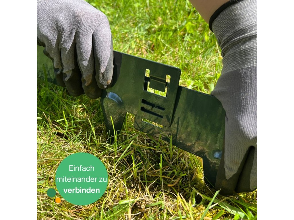 Es hängt von der Bodenart ab, in die die Rasenkante eingesetzt wird. In jedem Fall empfehlen wir, den Boden zuerst vorzubereiten, indem Sie mit einem Spaten einen Graben ziehen, in den die Rasenkante anschließend eingesetzt wird. Die eingesetzte Rasenkante können Sie dann mit einem Holzklotz leicht einschlagen – legen Sie den Klotz auf die obere Kante der Rasenkante und klopfen Sie vorsichtig mit einem Gummihammer darauf. Bitte beachten Sie: Beim Einschlagen in harten Boden ohne vorherige Vorbereitung besteht die Gefahr, die obere Kante der Rasenkante zu beschädigen. Für eine leichtere und komfortablere Montage legen wir jeder Lieferung zusätzlich Schutzhandschuhe bei. -