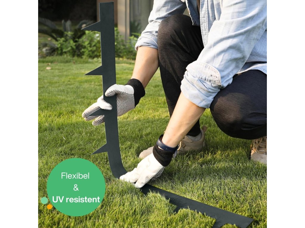 Die Rasenkante mit Spitzen und einer Stärke von 1,6 mm ist relativ stabil und daher weniger flexibel. Grundsätzlich lässt sie sich biegen, jedoch ist Vorsicht geboten. Wenn Sie eine kreisförmige oder gebogene Form erstellen möchten, empfehlen wir, die Rasenkante in kleinen Abschnitten zu biegen und gleichmäßigen Druck anzuwenden, um das gewünschte Ergebnis zu erzielen und Beschädigungen zu vermeiden. Es ist möglich, Kreise oder Bögen zu formen, aber dies hängt immer von deren Größe und der Anzahl der verbundenen Abschnitte (Rasenkanten) ab.