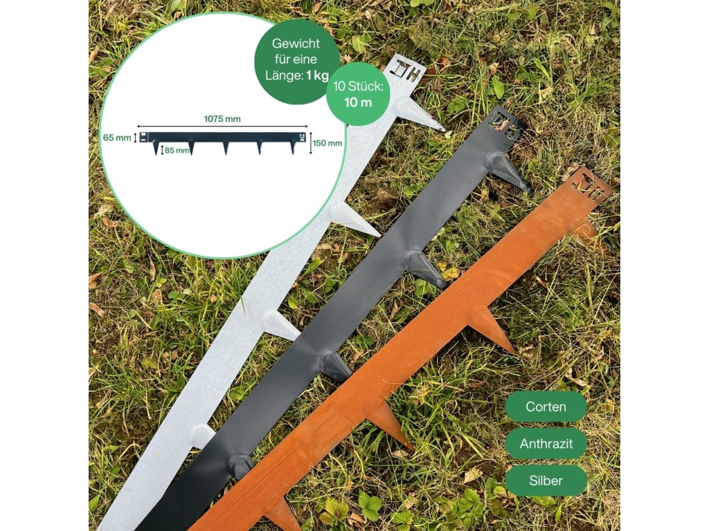 Diese Rasenkante mit einer Höhe von 150 mm und einer Dicke von 1,6 mm ist eine hochwertige, flexible Stahlkonstruktion. Dieses Metall Material gewährleistet die Haltbarkeit und Langlebigkeit dieser Metall Beetumrandung. Es ist eine robuste Lösung für verschiedene Anwendungen zur Garteneinfassung.