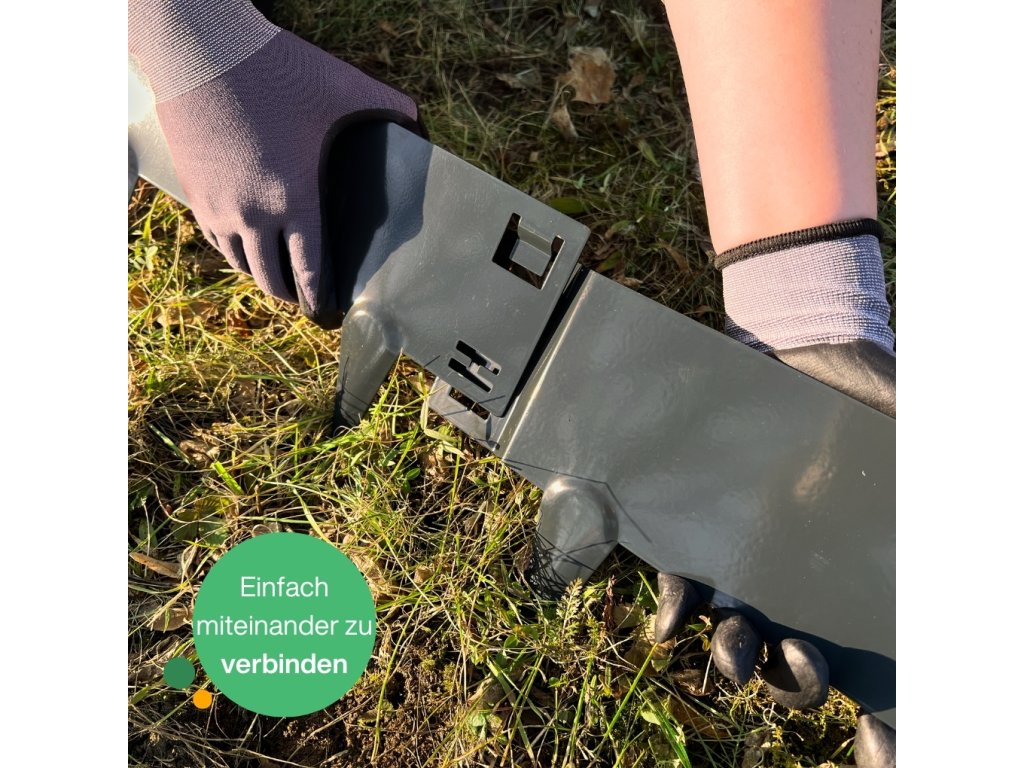 Es hängt von der Bodenart ab, in die die Rasenkante eingesetzt wird. In jedem Fall empfehlen wir, den Boden zuerst vorzubereiten, indem Sie mit einem Spaten einen Graben ziehen, in den die Rasenkante anschließend eingesetzt wird. Die eingesetzte Rasenkante können Sie dann mit einem Holzklotz leicht einschlagen – legen Sie den Klotz auf die obere Kante der Rasenkante und klopfen Sie vorsichtig mit einem Gummihammer darauf. Bitte beachten Sie: Beim Einschlagen in harten Boden ohne vorherige Vorbereitung besteht die Gefahr, die obere Kante der Rasenkante zu beschädigen. Für eine leichtere und komfortablere Montage legen wir jeder Lieferung zusätzlich Schutzhandschuhe bei. -