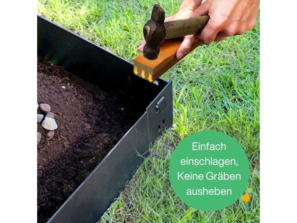 Die 18,5 cm hohe Rasenkante aus Metall mit Erdspießen in Anthrazit vereint Eleganz und Praktikabilität. Kein Graben, kein Aufwand – einfach in den Boden einschlagen, und dank der einfachen Verbindung der Elemente entsteht eine stabile und durchgehende Kante. Die anthrazitfarbene Oberfläche verleiht dem Garten ein modernes, zeitloses Aussehen, das viele Jahre hält.