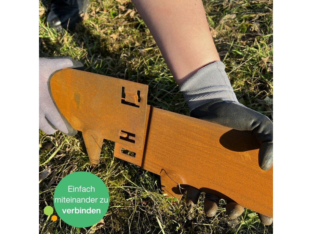 Es hängt von der Bodenart ab, in die die Corten-Rasenkante eingesetzt wird. In jedem Fall empfehlen wir, den Boden zuerst vorzubereiten, indem Sie mit einem Spaten einen Graben ziehen, in den die Rasenkante anschließend eingesetzt wird. Die eingesetzte Rasenkante können Sie dann mit einem Holzklotz leicht einschlagen – legen Sie den Klotz auf die obere Kante der Rasenkante und klopfen Sie vorsichtig mit einem Gummihammer darauf. Bitte beachten Sie: Beim Einschlagen in harten Boden ohne vorherige Vorbereitung besteht die Gefahr, die obere Kante der Rasenkante zu beschädigen. Für eine leichtere und komfortablere Montage legen wir jeder Lieferung zusätzlich Schutzhandschuhe bei. -