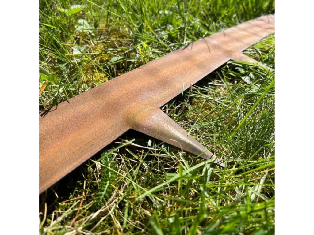 Die Rasenkante ist aus einer hochwertigen Corten-Stahl-Legierung hergestellt. Es handelt sich nicht um ein Rostspray, sondern um ein natürlich reagierendes Material, das im Laufe der Zeit und durch Verwitterung eine dekorative Rostpatina erhalten hat.