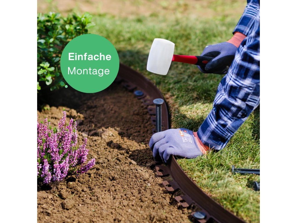 Garten-Beetumrandungen werden mit passenden Erdnägel geliefert, die in die Grenzen des Rasenzauns und der Beetumrahmung gedrückt werden können.