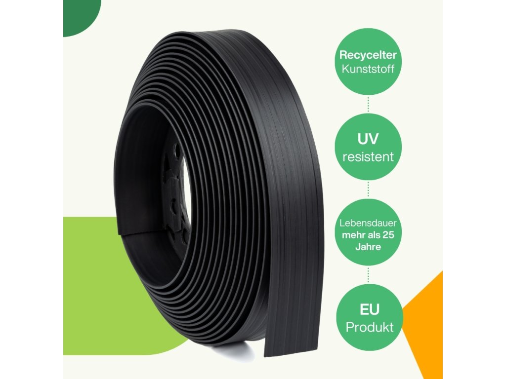 Die Beetbegrenzung ist aus hochwertigem recyceltem PE-Material zum Schutz der Umwelt hergestellt. Das Material unserer Gartenumrandung ist hervorragend, der Kunststoff ist sehr stark und reißt nicht.